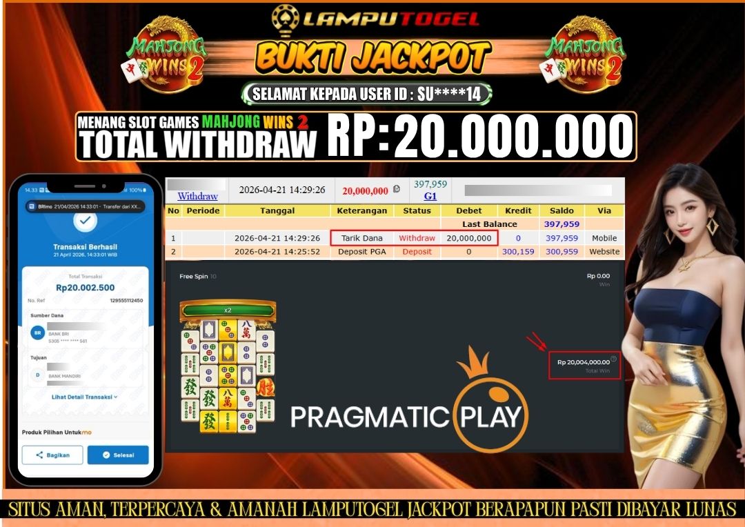 Bukti Pembayaran Lamputogel 21 April 2026 – Selamat kepada SU****14 yang berhasil meraih kemenangan di permainan MAHJONG WINS 2 sebesar Rp 20.000.000,– atau Dua puluh juta ratus ribu rupiah ! Berikut ini terlampir bukti JP Lamputogel.