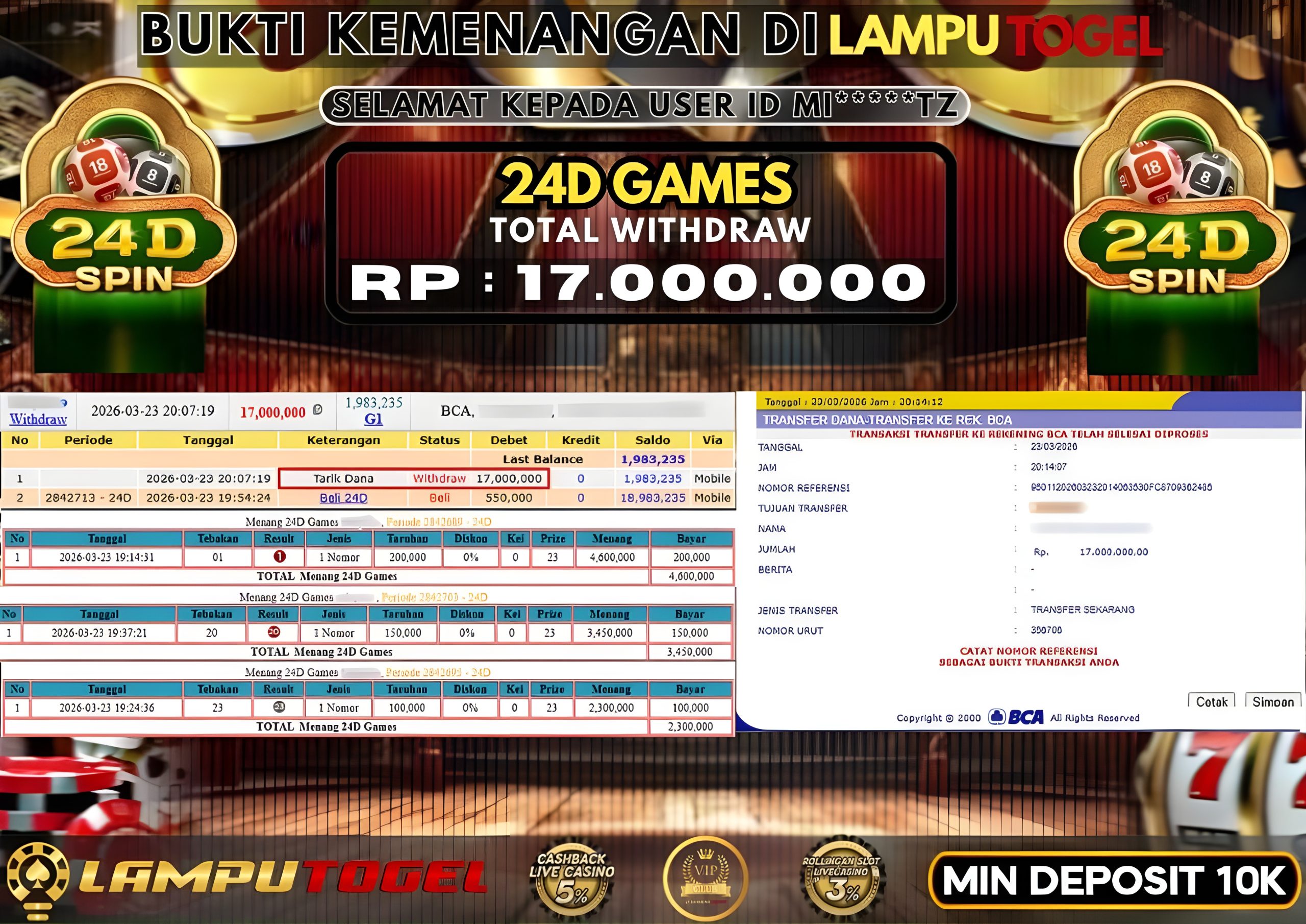 Bukti Pembayaran Lamputogel 23 Maret 2026 – Selamat kepada MI*****TZ yang berhasil meraih kemenangan di permainan 24D GAMES sebesar Rp 17.000.000,– atau Tujuh belas juta ribu rupiah ! Berikut ini terlampir bukti JP Lamputogel.