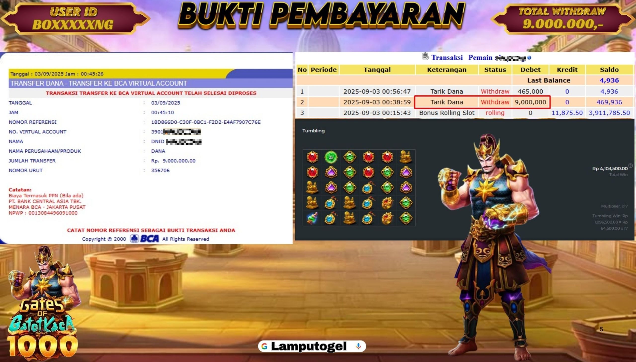 Bukti Pembayaran Lamputogel 3 September 2025 – Selamat kepada BO****NG yang berhasil meraih kemenangan di permainan GATES OF GATOT KACA 1000 sebesar Rp 9.000 .000,– atau Sembilan juta ribu rupiah ! Berikut ini terlampir bukti JP Lamputogel.