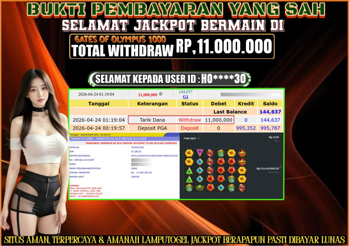 Bukti Pembayaran Lamputogel 24 April 2026 – Selamat kepada HO****30 yang berhasil meraih kemenangan di permainan GATES OF OLYMPUS 1000 sebesar Rp 11.000.000,– atau Sebelas juta ribu rupiah ! Berikut ini terlampir bukti JP Lamputogel.