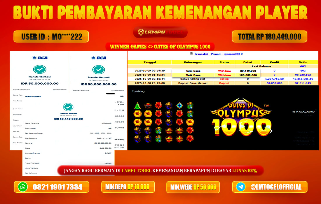 Bukti Pembayaran Lamputogel 09 Oktober 2025 – Selamat kepada MO****222 yang berhasil meraih kemenangan di permainan GATES OF OLYMPUS 1000 sebesar Rp 180.449 .000,– atau Seratus delapan puluh empat ratus empat puluh sembilan juta ribu rupiah ! Berikut ini terlampir bukti JP Lamputogel.