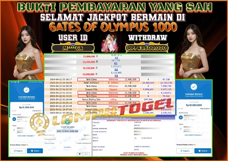 Bukti Pembayaran Lamputogel 22 April 2026 – Selamat kepada M****CA yang berhasil meraih kemenangan di permainan GATES OF OLYMPUS 1000 sebesar Rp 43.600.000,– atau Empat puluh tiga juta enam ratus ribu rupiah ! Berikut ini terlampir bukti JP Lamputogel.
