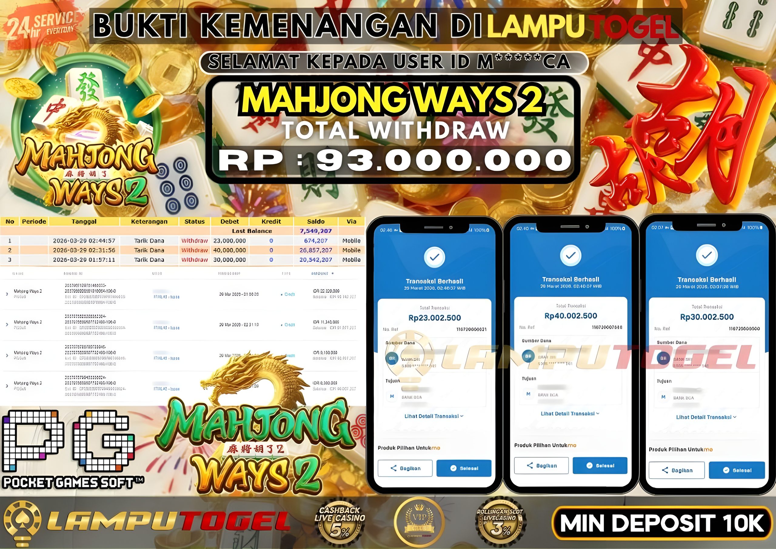 Bukti Pembayaran Lamputogel 29 Maret 2026 – Selamat kepada M*****CA yang berhasil meraih kemenangan di permainan MAHJONG WAYS 2 sebesar Rp 93.000.000,– atau Sembilan puluh tiga juta ribu rupiah ! Berikut ini terlampir bukti JP Lamputogel.