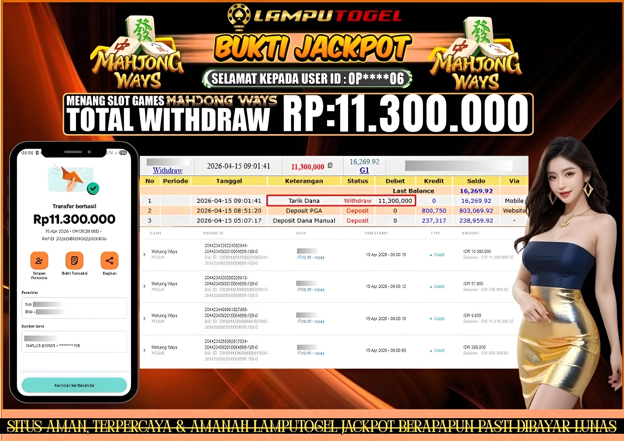 Bukti Pembayaran Lamputogel 15 April 2026 – Selamat kepada OP*****O6 yang berhasil meraih kemenangan di permainan MAHJONG WAYS sebesar Rp 11.300.000,– atau Sebelas juta tiga ratus ribu rupiah ! Berikut ini terlampir bukti JP Lamputogel.