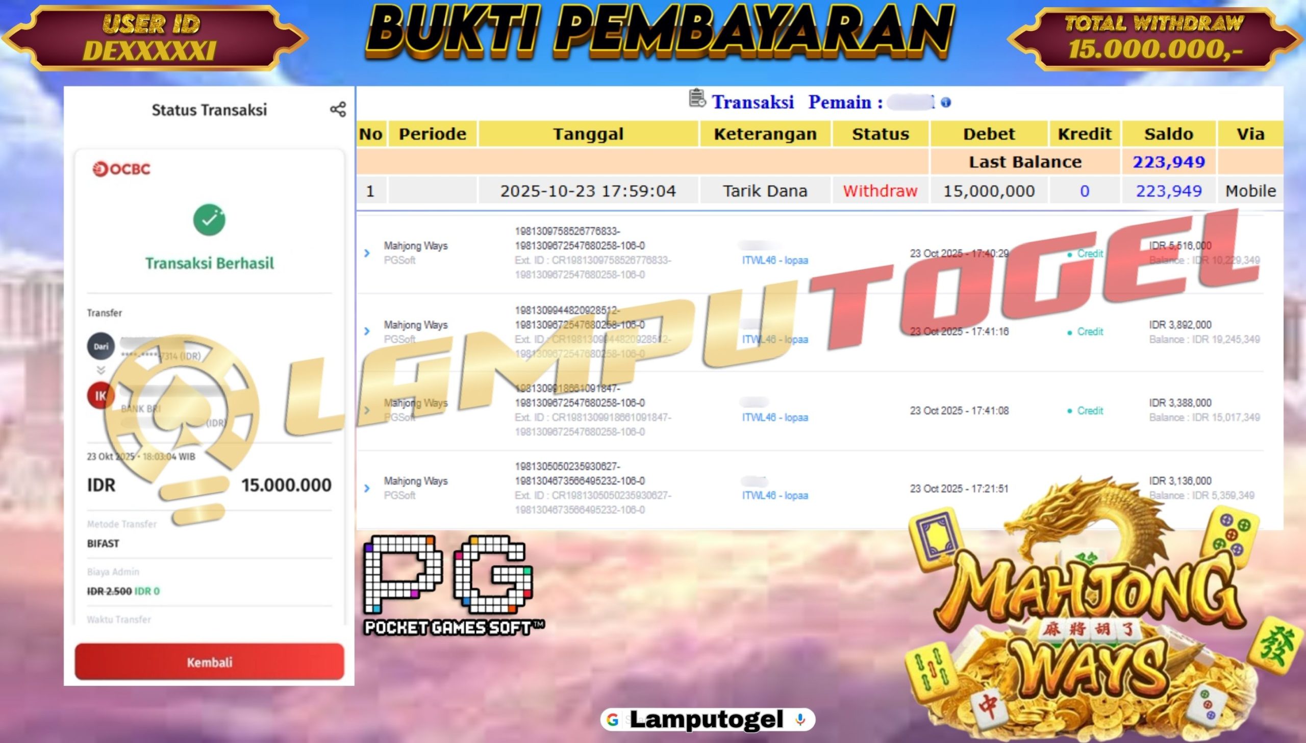 Bukti Pembayaran Lamputogel 23 Oktober 2025 – Selamat kepada DE******DI yang berhasil meraih kemenangan di permainan MAHJONG WAYS sebesar Rp 15.000.000,– atau Lima belas juta ribu rupiah ! Berikut ini terlampir bukti JP Lamputogel.