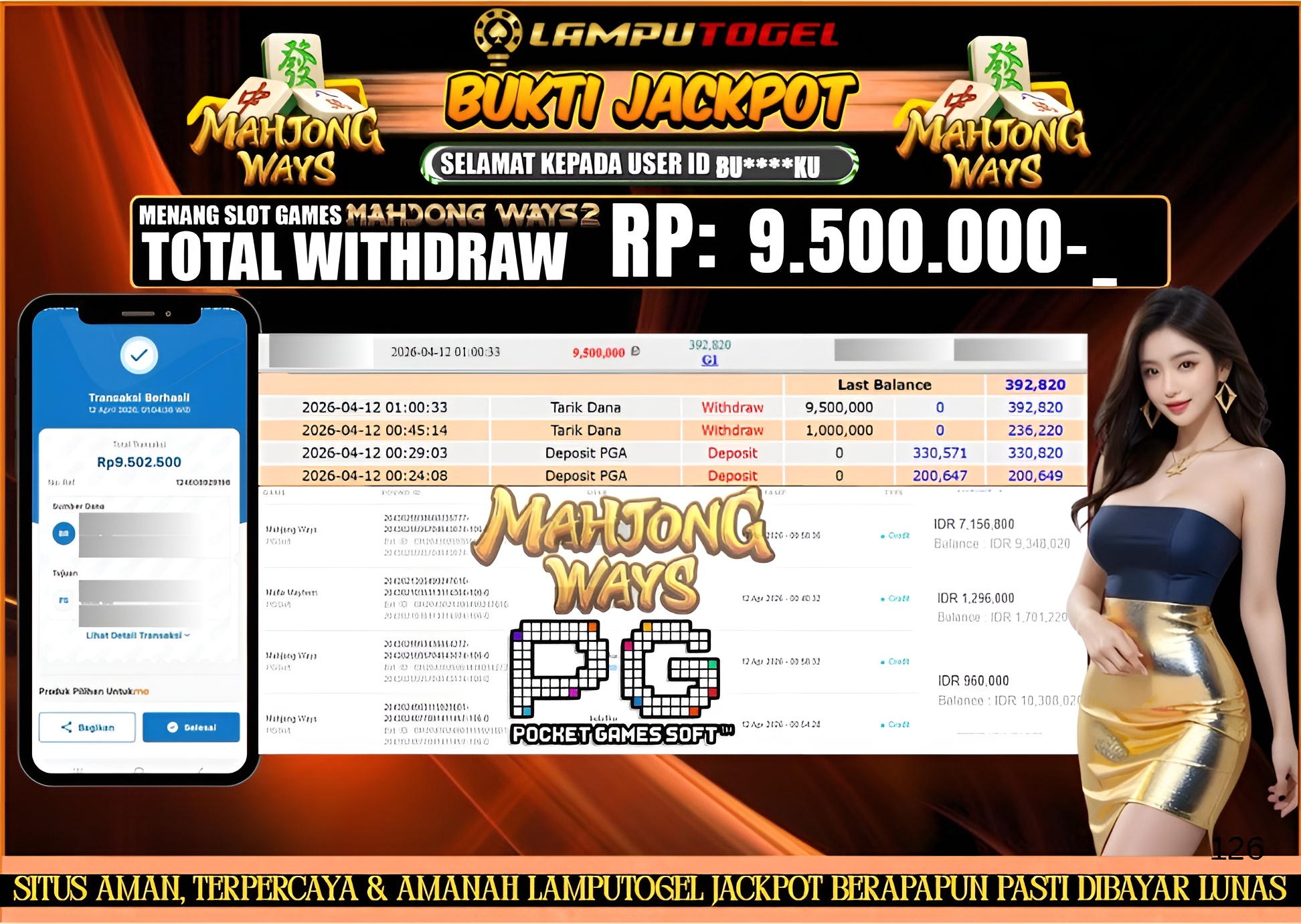 Bukti Pembayaran Lamputogel 12 April 2026 – Selamat kepada BU*****KU yang berhasil meraih kemenangan di permainan MAHJONG WAYS sebesar Rp 9.500.000,– atau Sembilan juta lima ratus ribu rupiah ! Berikut ini terlampir bukti JP Lamputogel.