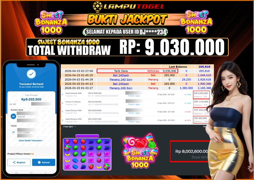 Bukti Pembayaran Lamputogel 15 April 2026 – Selamat kepada DJ*****234 yang berhasil meraih kemenangan di permainan SWEET BONANZA 1000 sebesar Rp 9.030.000,– atau Sembilan juta tiga puluh ribu rupiah ! Berikut ini terlampir bukti JP Lamputogel.