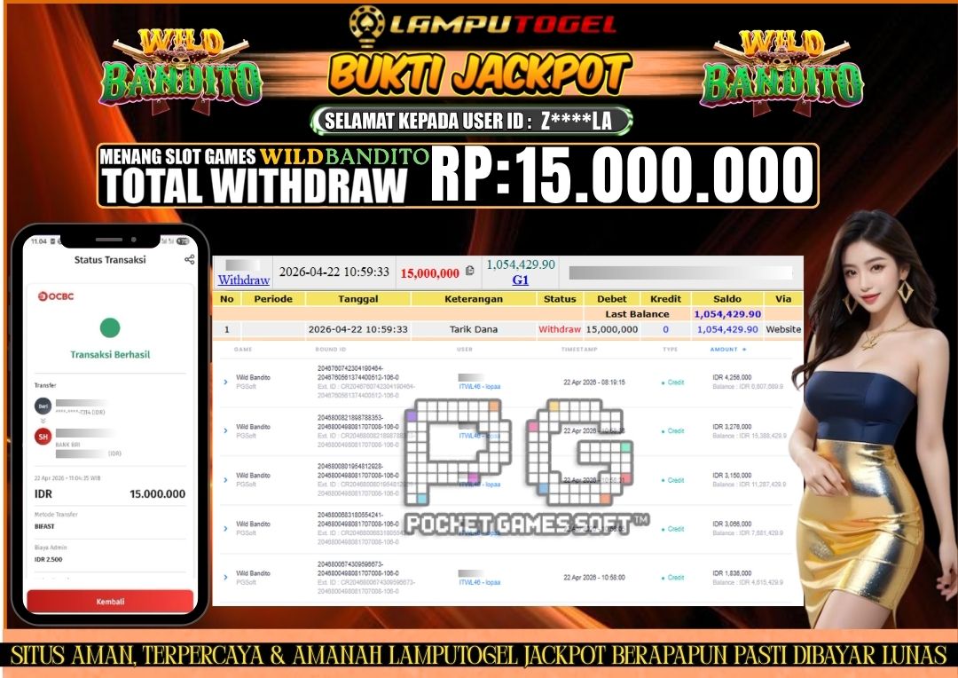 Bukti Pembayaran Lamputogel 22 April 2026 – Selamat kepada Z*****LA yang berhasil meraih kemenangan di permainan WILD BANDITO sebesar Rp15.000.000,– atau Lima belas juta ribu rupiah ! Berikut ini terlampir bukti JP Lamputogel.
