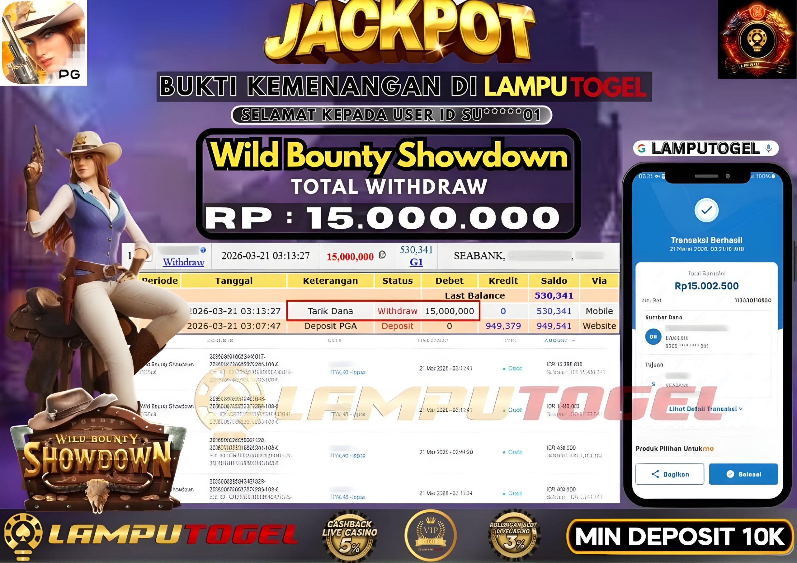 Bukti Pembayaran Lamputogel 21 Maret 2026 – Selamat kepada SU*****01 yang berhasil meraih kemenangan di permainan WILD BOUNTY SHOWDOWN sebesar Rp 15.000.000,– atau Lima belas juta ribu rupiah ! Berikut ini terlampir bukti JP Lamputogel.