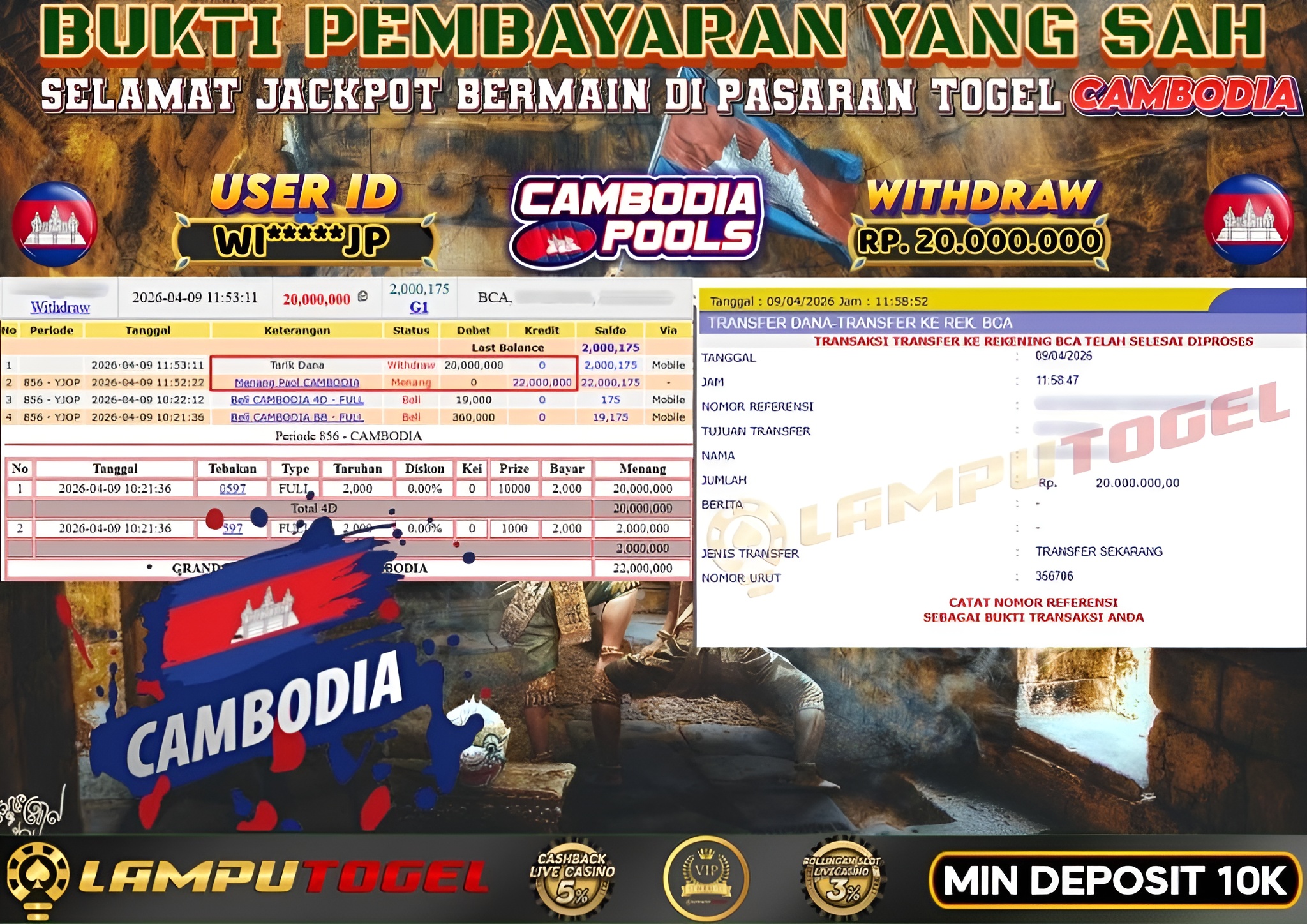 Bukti Pembayaran Lamputogel 9 April 2026 – Selamat kepada WI****JP yang berhasil meraih kemenangan di pasaran CAMBODIA sebesar Rp.20.000.000,– atau Dua puluh juta ribu rupiah ! Berikut ini terlampir bukti JP Lamputogel.
