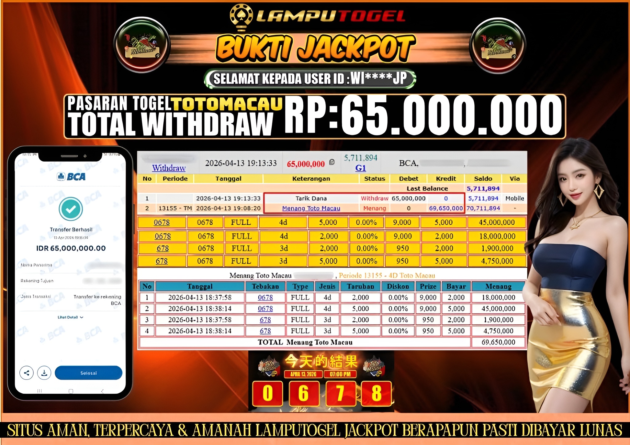 Bukti Pembayaran Lamputogel 13 April 2026 – Selamat kepada WI****JP yang berhasil meraih kemenangan di pasaran TOTO MACAU 4D sebesar Rp.65.000.000,– atau Enam puluh lima juta ribu rupiah ! Berikut ini terlampir bukti JP Lamputogel.